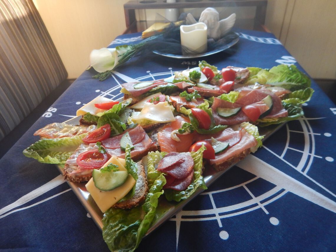 Die Bewirtung unserer Fahrgäste mit Kaffee, Tee und anderen Getränken übernimmt die Bordgastronomie. Kuchen, Schnittchenplatten, belegte Brötchen, kalte Buffets oder Holsteiner Schinkenplatte, umfangreicher Käseauswahl bis hin zu Räucherfischplatten mit Aal, Makrele, Heilbutt und Heringsfilets bestellen Sie bitte rechtzeitig (mindestens 10 Tage) vor der Ausfahrt direkt bei uns.